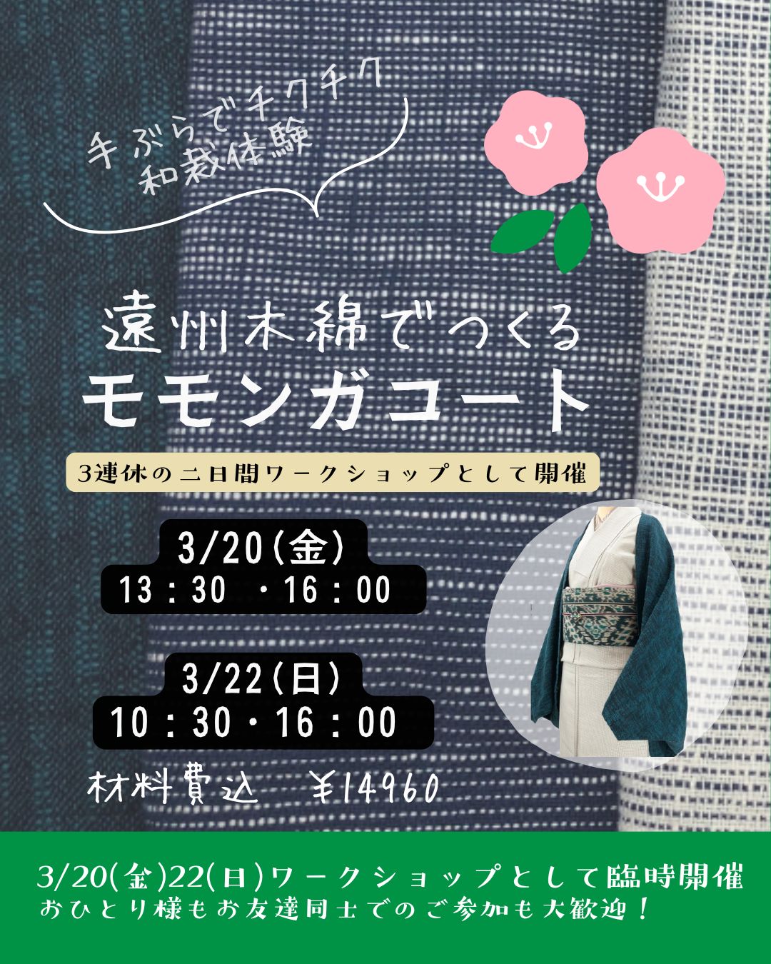 阿佐谷散策&和裁体験いかがですか?3/22(日)追加設定!遠州木綿でつくるモモンガコートつくり
