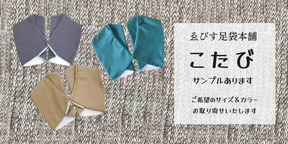 つま先と甲の部分を切り落としたような不思議な形状の足袋『こたび』足にお悩みのある方、一度お試しになってみませんか?実店舗には各サイズサンプルをご用意しております。